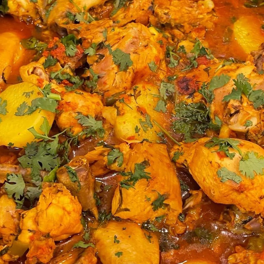 Deliciosa galinha guisada, acompanhada de arroz, macarrão temperado, feijão mulatinho ou preto a sua escolha, com o sabor que todos amam, marmita feita na hora para chegar bem quentinha.