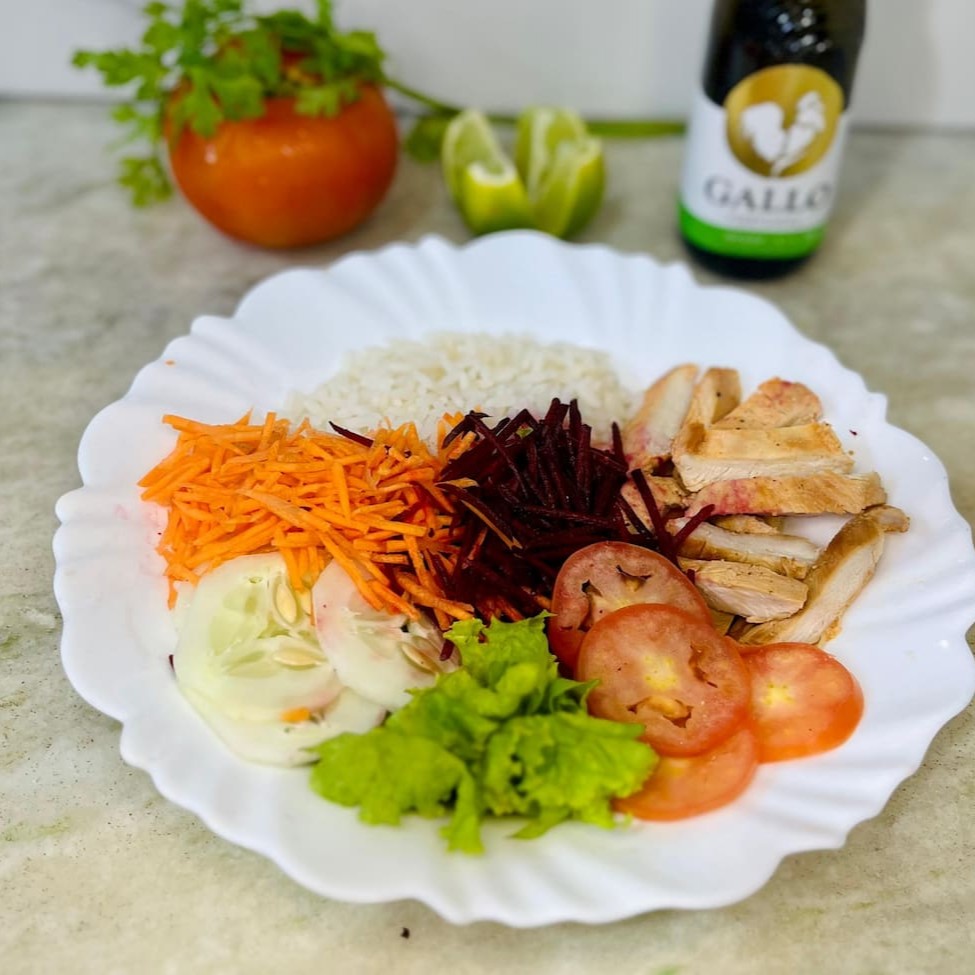 Deliciosa marmita de iscas de filé de frango, acompanhado de arroz branco e uma saborosa salada crua de alface, tomate, pepino, beterraba e cenoura raladas, levemente regada com fios de azeite extra virgem.