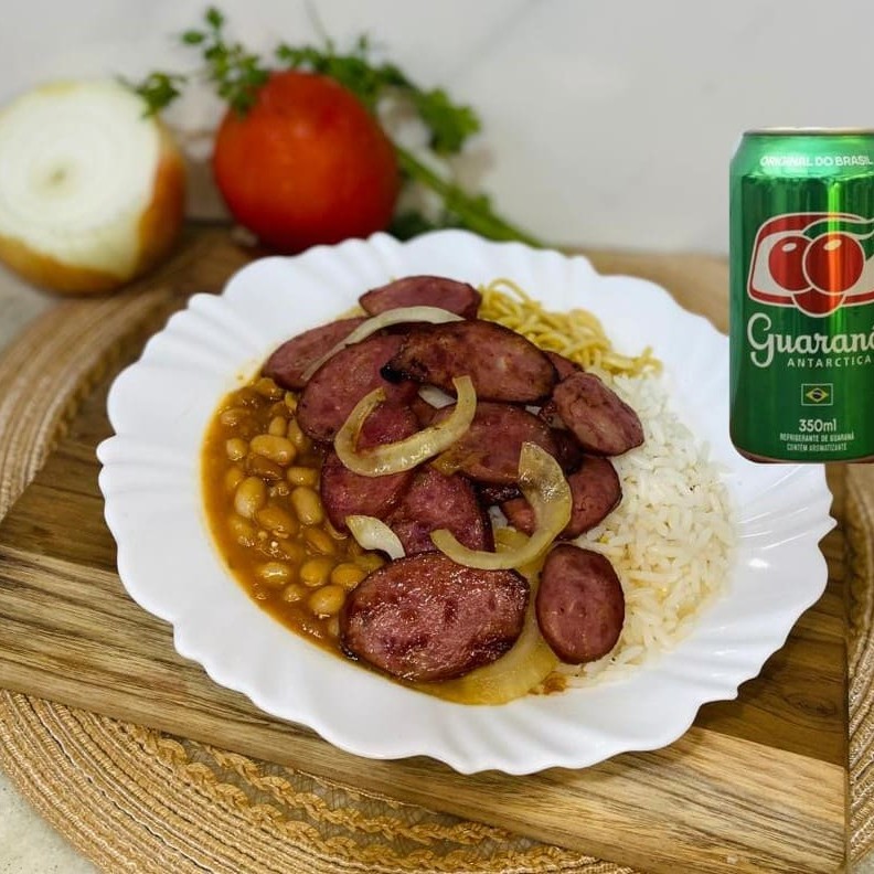 Excelente calabresa acebolada, acompanhada de arroz branco, macarrão, feijão preto ou mulatinho, à sua escolha. Tudo preparado na hora para seu almoço chegar quentinho até você. + Bebida gelada