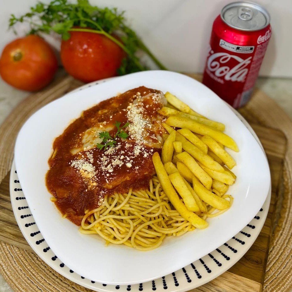 Deliciosa Parmegiana de frango, com filé de frango empanado, coberto com nosso molho de tomate caseiro e gratinado com mussarela. Acompanha à sua escolha macarrão ou arroz, junto com batata frita e queijo ralado. + Coca