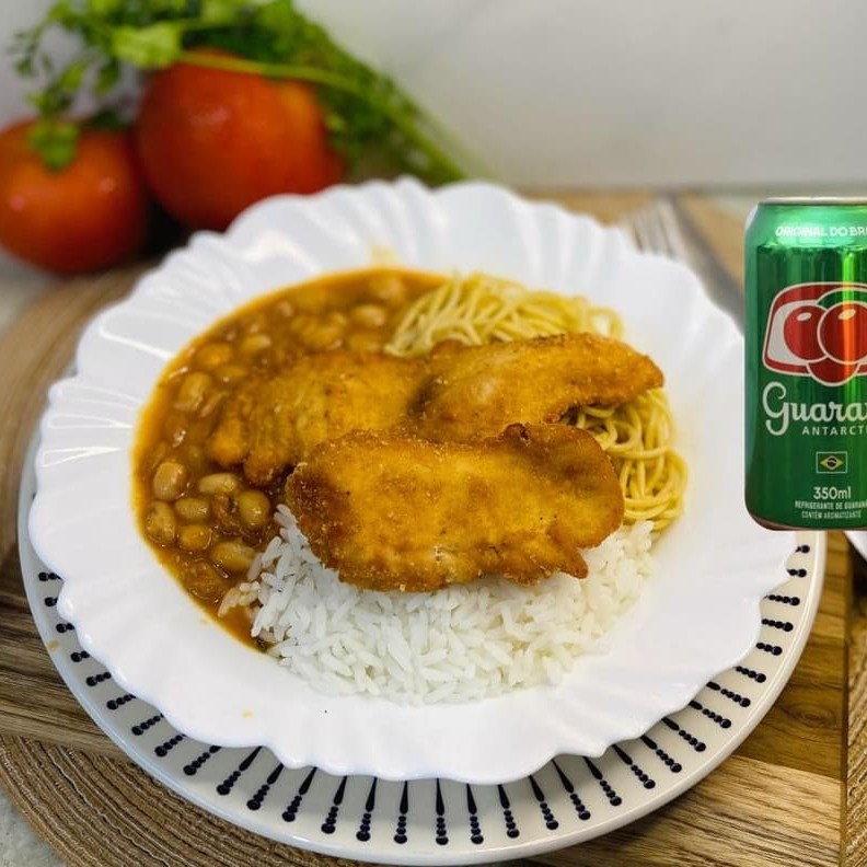 Delicioso filé de frango empanado, acompanhado de arroz, macarrão, feijão mulatinho ou preto, à sua escolha. + Antarctica