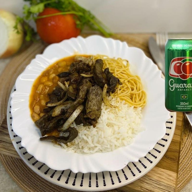 Delicioso fígado acebolado, acompanhado de arroz branco, macarrão, feijão preto ou mulatinho, à sua escolha. Tudo preparado na hora para sua comida chegar quentinha. + Bebida gelada