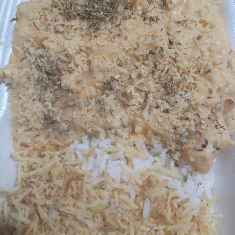 Macaxeira,frango desfiado acebolado,queijo mussarela,alho,queijo ralado, orégano,, batata palha ou frita acompanha arroz