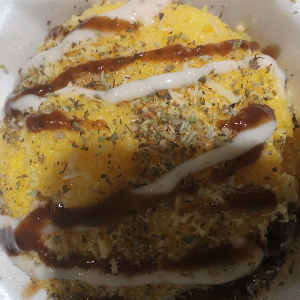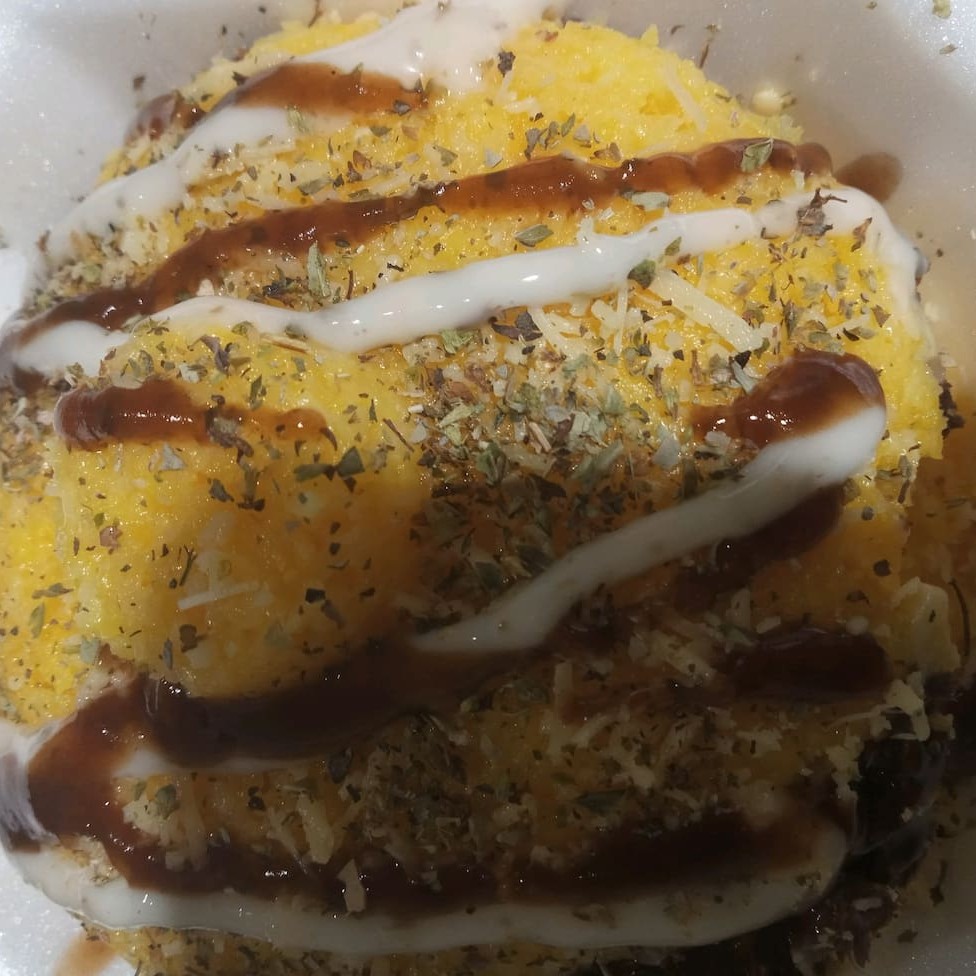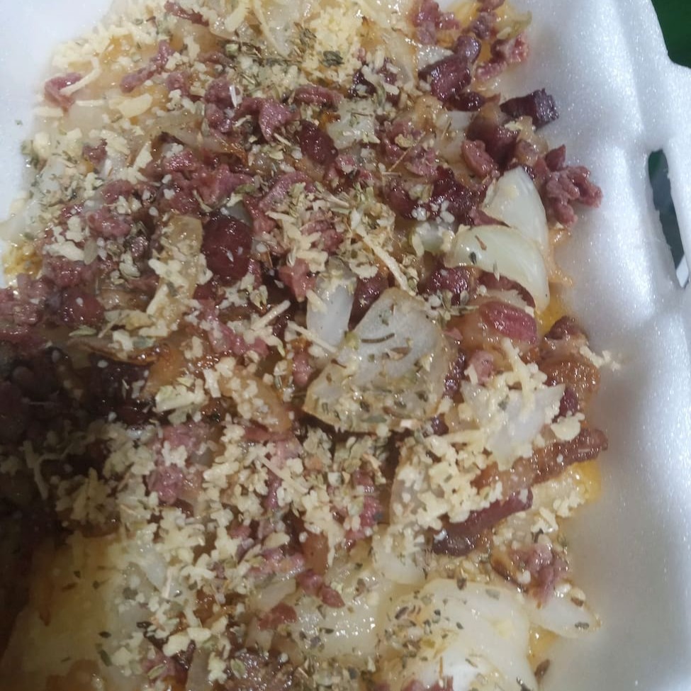 Mavaxeira com a cpharque acebolada e oregano , barbecue,queijo ralado