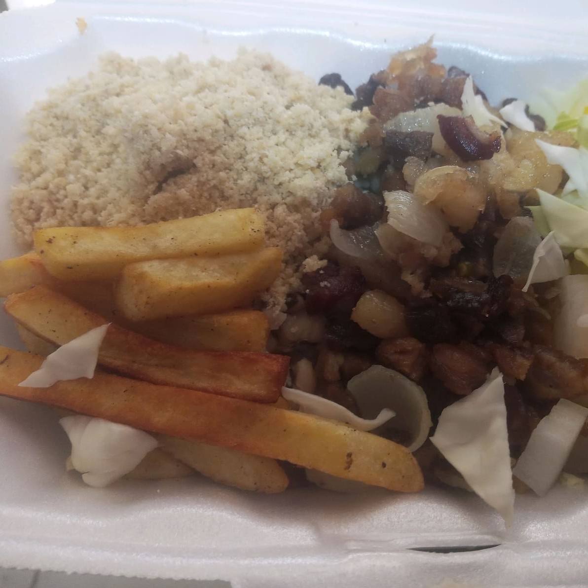 Feijão macassar,farofa de cuscuz, vinagretes e batata frita ou palha