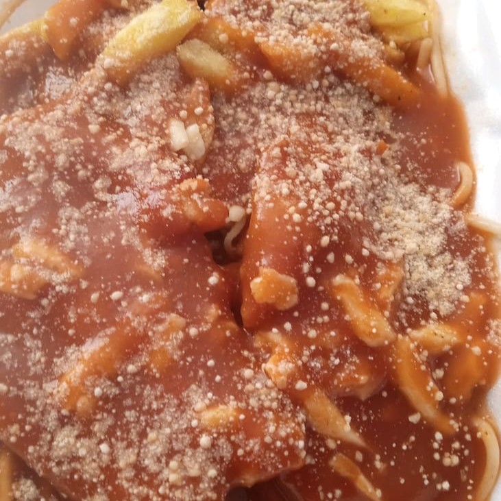 1 parmegiana (macarrão, filé de peito de frango,molho,queijo mussarela,queijo ralado,orégano) 1 macarrão a bolonhesa(macarrão,molho, mussarela, queijo ralado e orégano)
