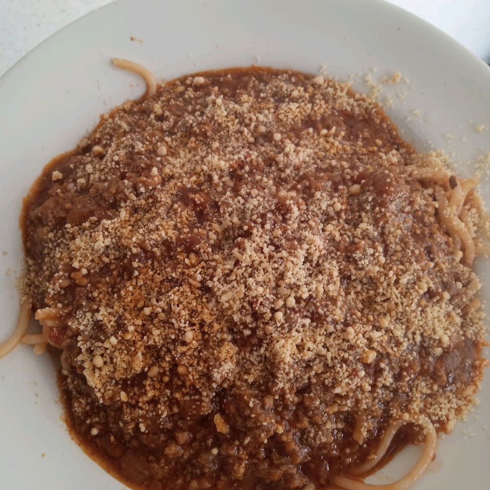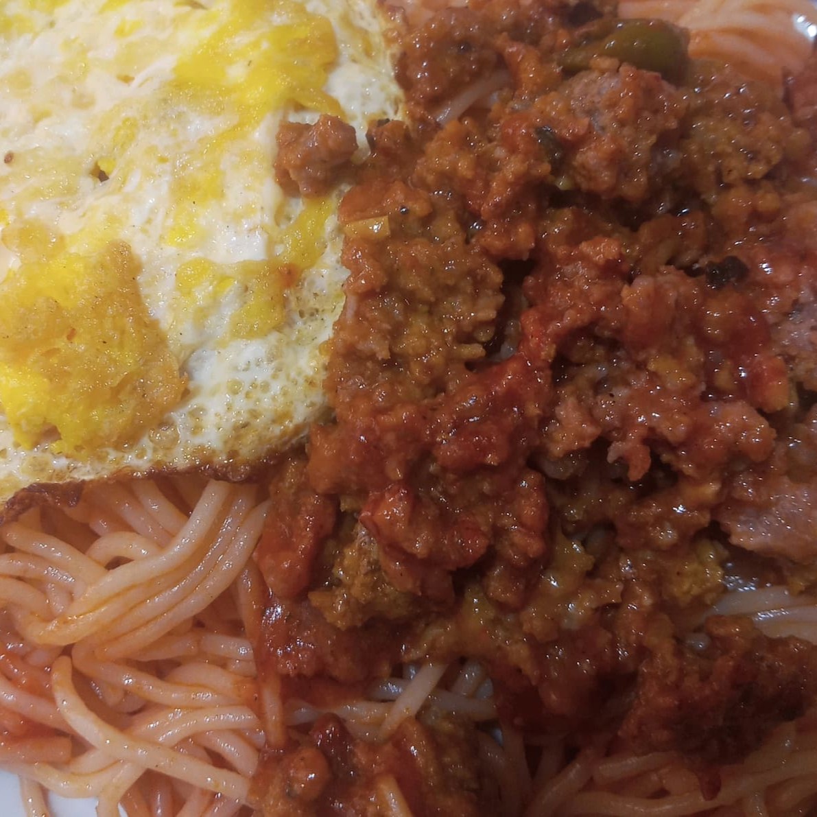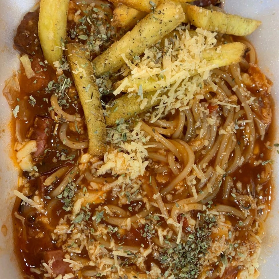 Macarrao ao molho ,ovo frito,carne moida,oregano,queijo ralado,barbecue creme de alho