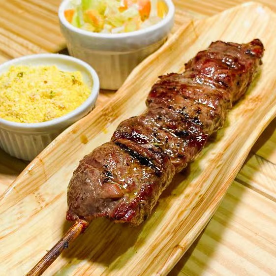 Espetinho de filé mignon acompanha farofa e vinagrete