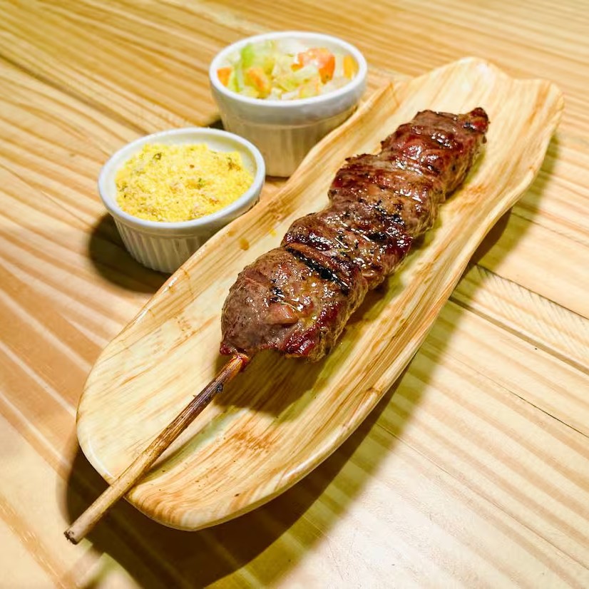 Espetinho de carne acompanha farofa e vinagrete