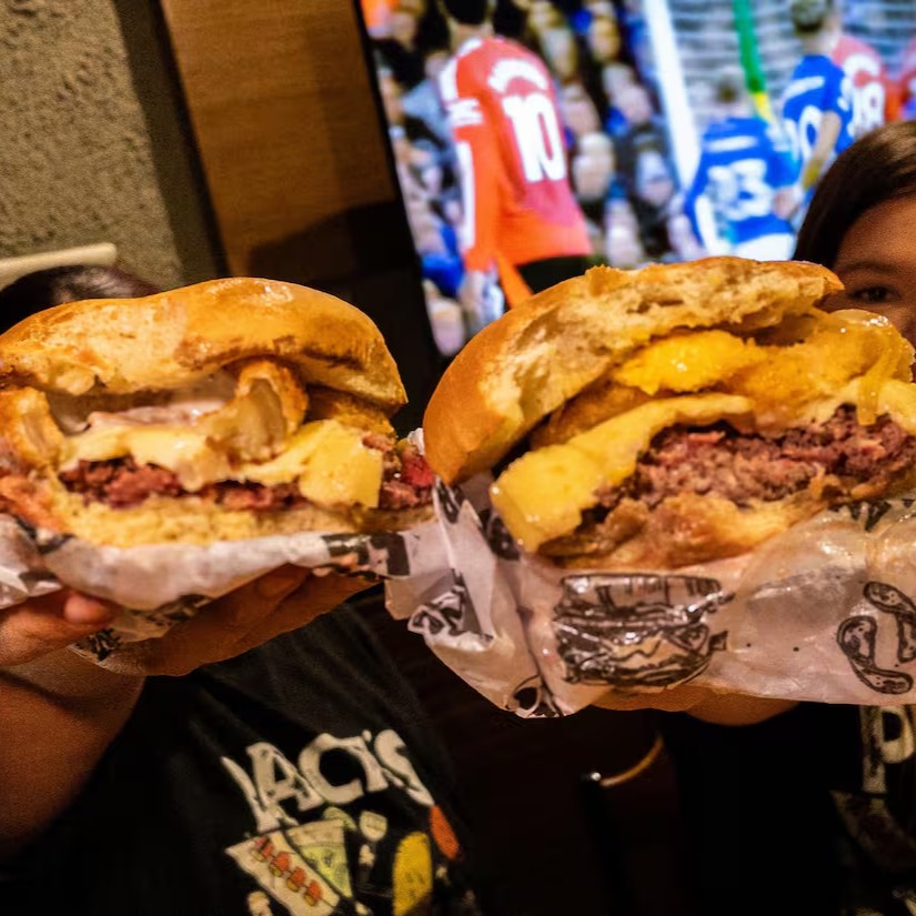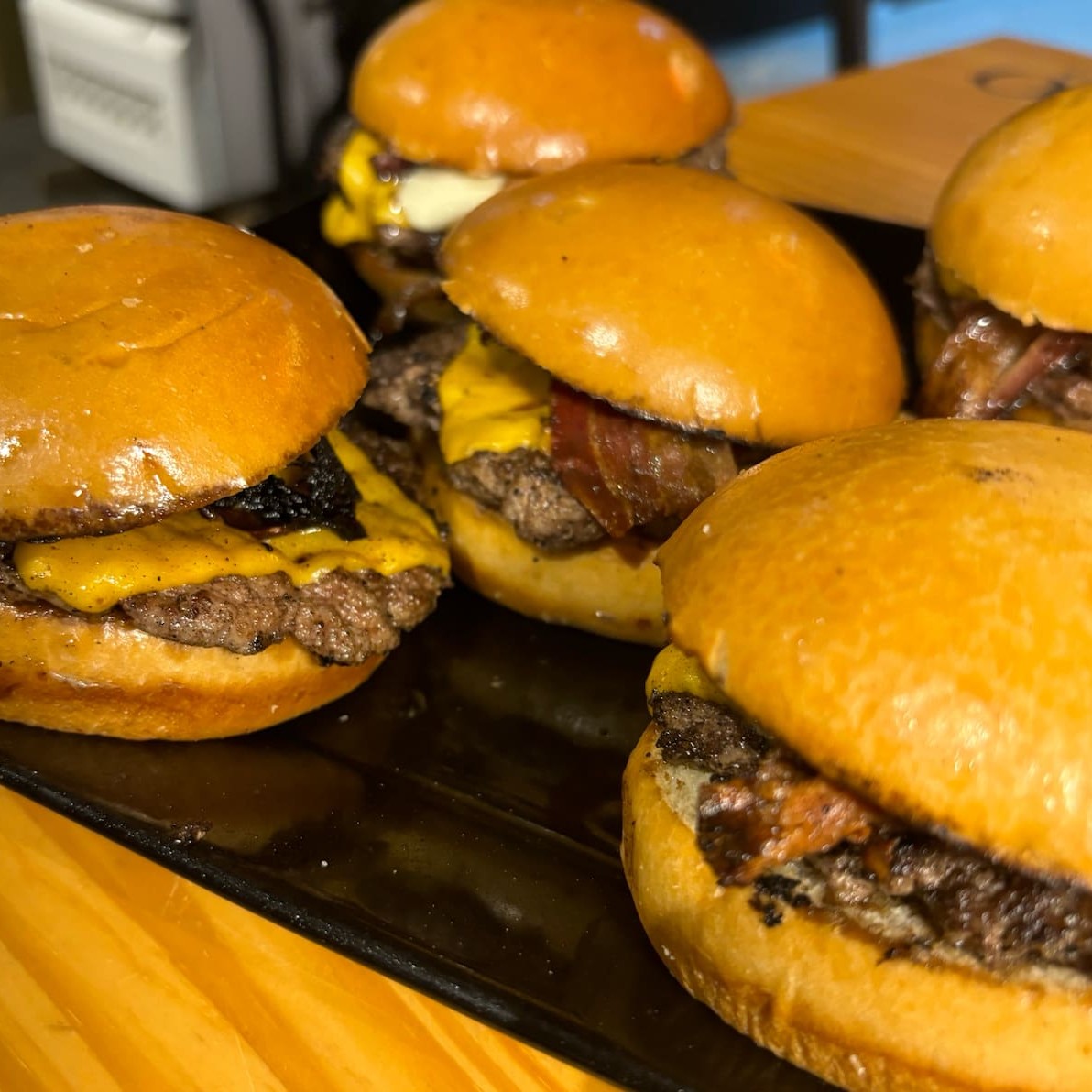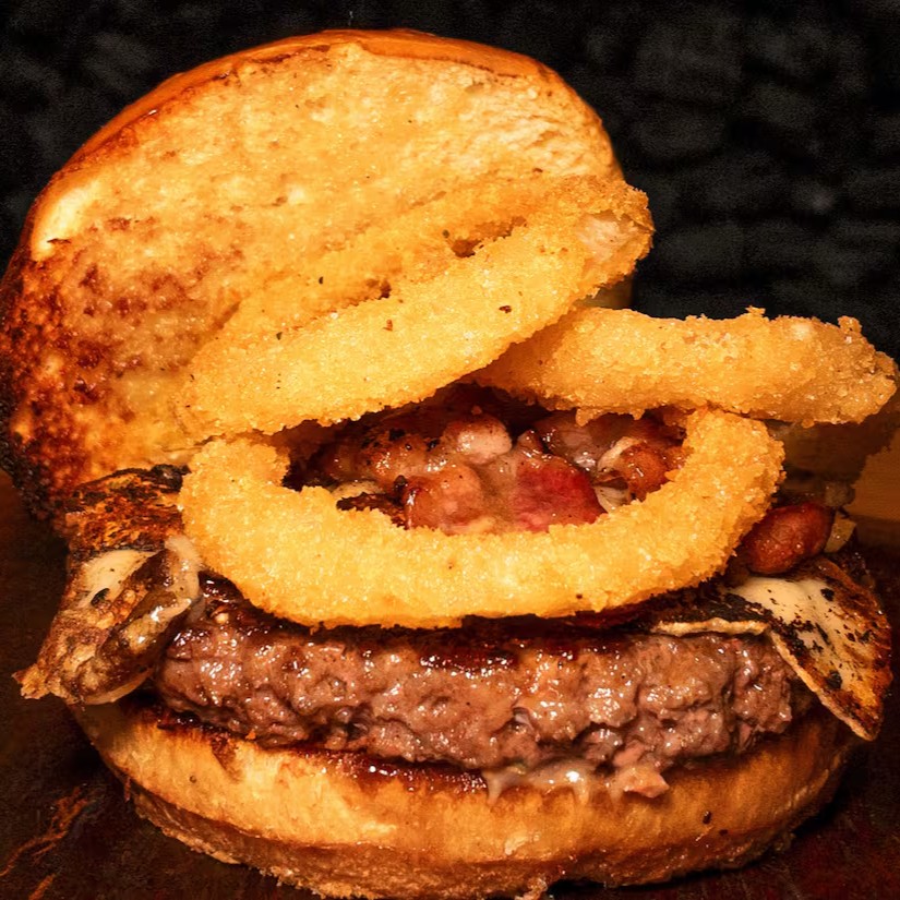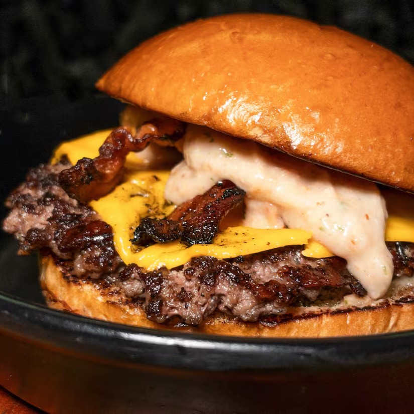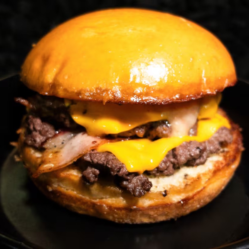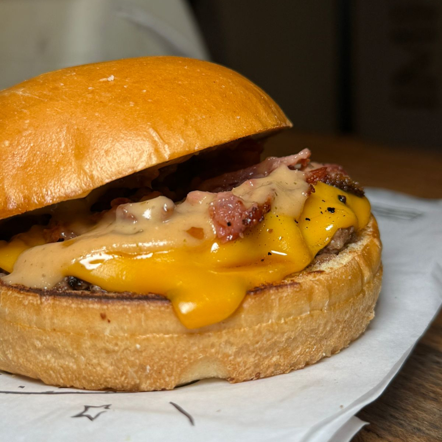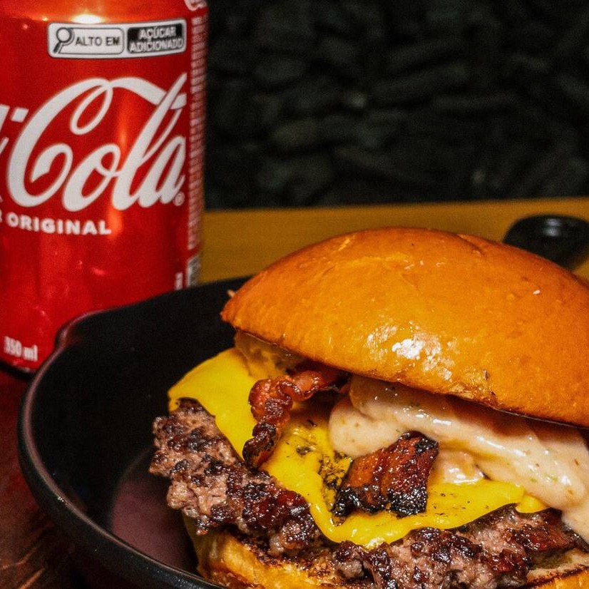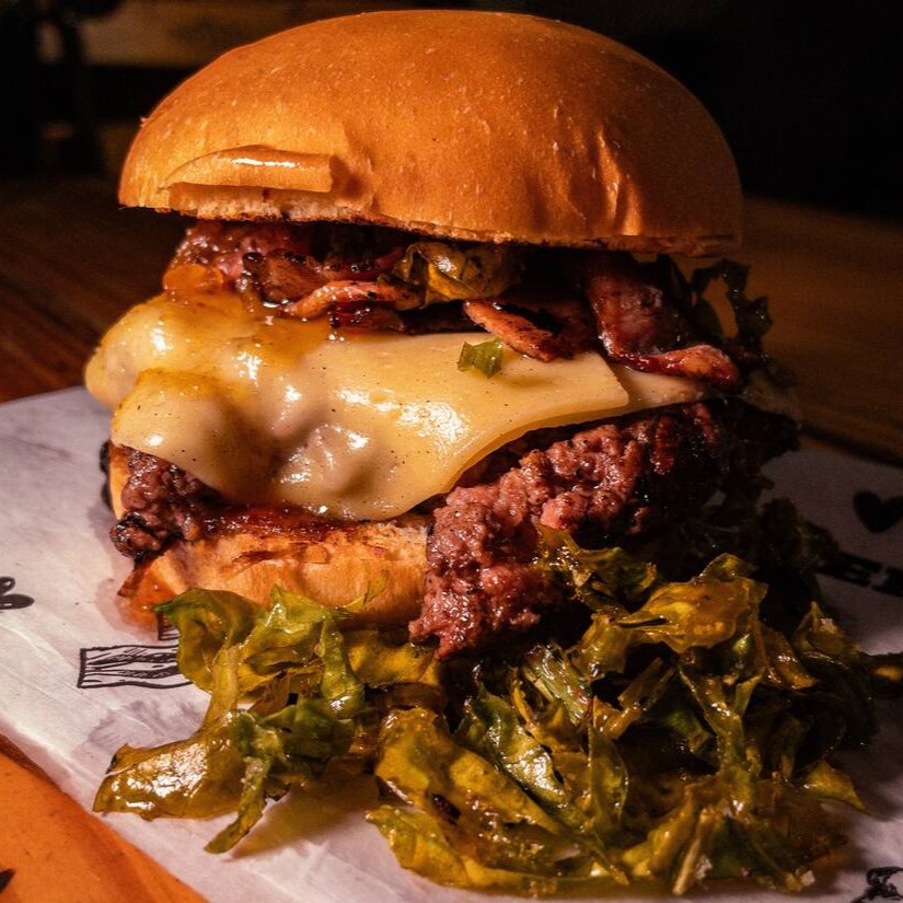 Pão amanteigado, blend de fraldinha, queijo cheddar, bacon e maionese Caseira