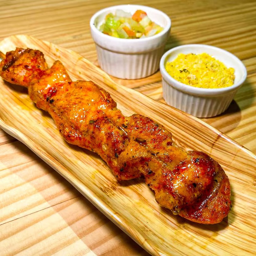 Espetinho de filé de peito de frango com tempero especial e farofa e vinagrete