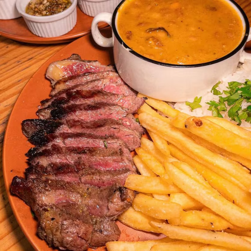 Arrox, feijão macassar, farofa caseira e Isca de Picanha Bov