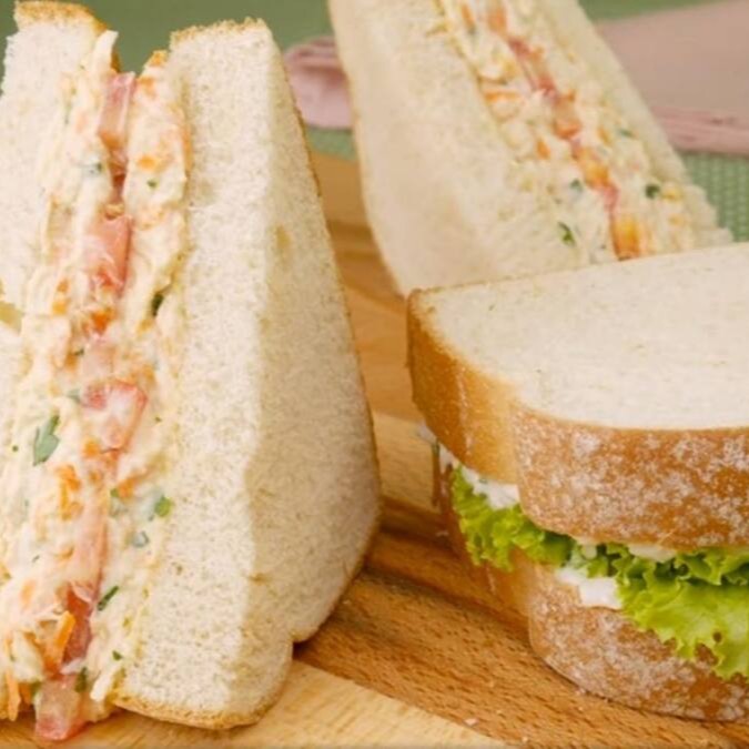 Pão de forma, frango, iogurte natural, requeijão, milho, cenoura ralada, especiarias, tomate e alface.