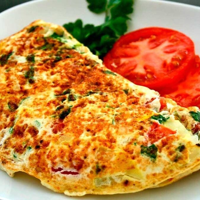 Ingredientes: 2 ovos, presunto, queijo coalho, tomate e cebola.