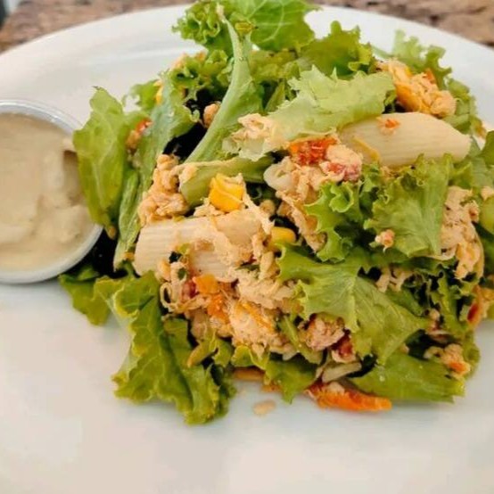 Ingredientes: Alface crespa, frango desfiado, tomate seco, uva passa, milho, penne. Acompanha o molho de mostarda.