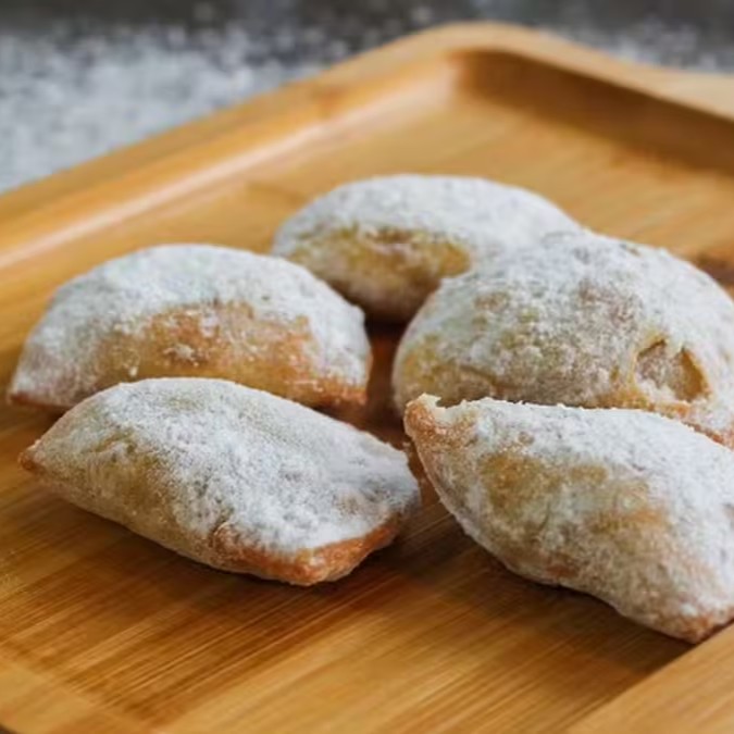 Pastel de carne polvilhado com açúcar.