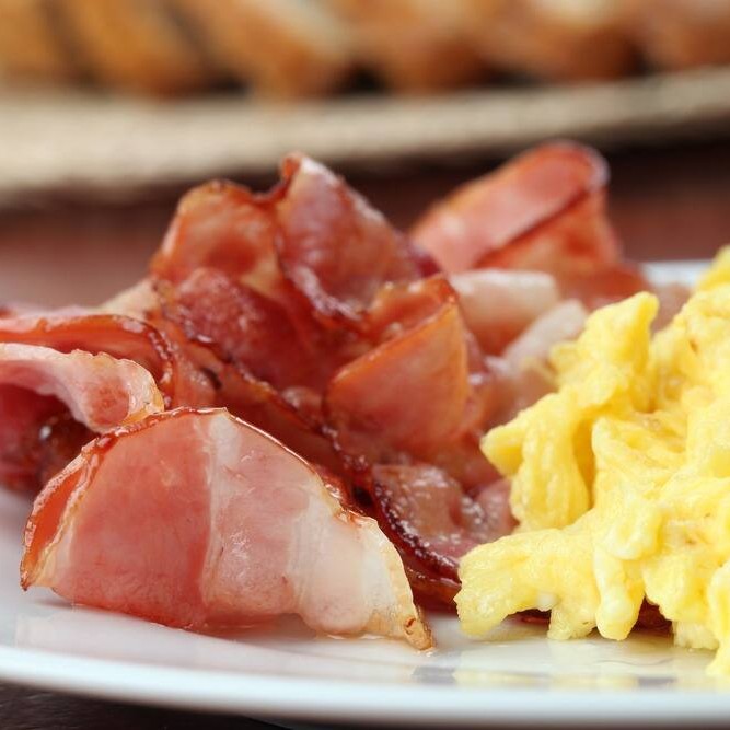 2 ovos mexidos, bacon e pão assado na chapa.