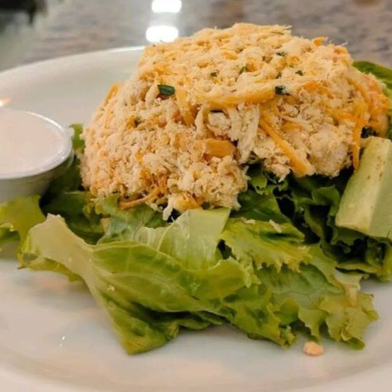 Ingredientes: Alface crespa, frango desfiado e queijo mussarela radado. Acompanha o molho Blue (iogurte com gorgonzola).