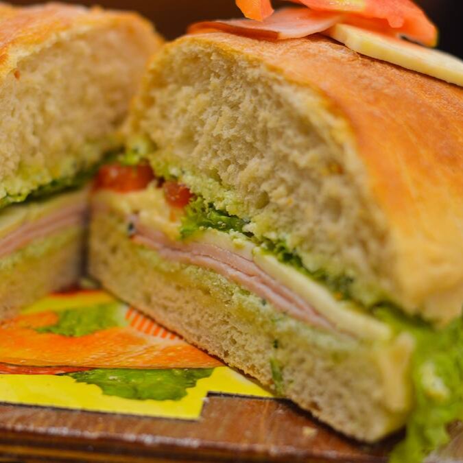 Ciabatta de 50cm com pasta de tomate seco, presunto assado, queijo do reino e alface. (imagem ilustrativa)