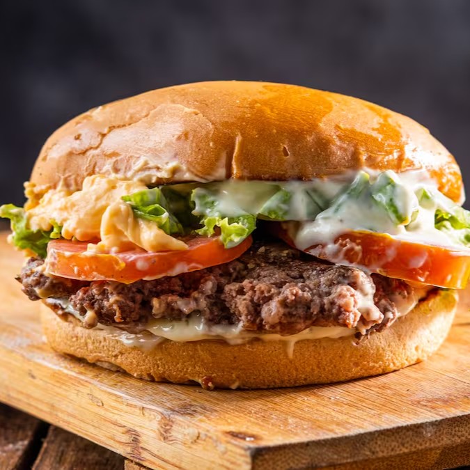 3 carnes de alta qualidade, pesando 60 gramas cada, cuidadosamente selecionadas e tostadas à perfeição na chapa. Acompanha a maionese cremosa artesanal realçada com fatias de queijo cheddar Polenghi, dando um toque de requinte ao prato. Finalizado com cebolas delicadamente refogadas na chapa, tomates frescos e alface americana, proporcionando uma explosão de sabores.