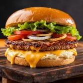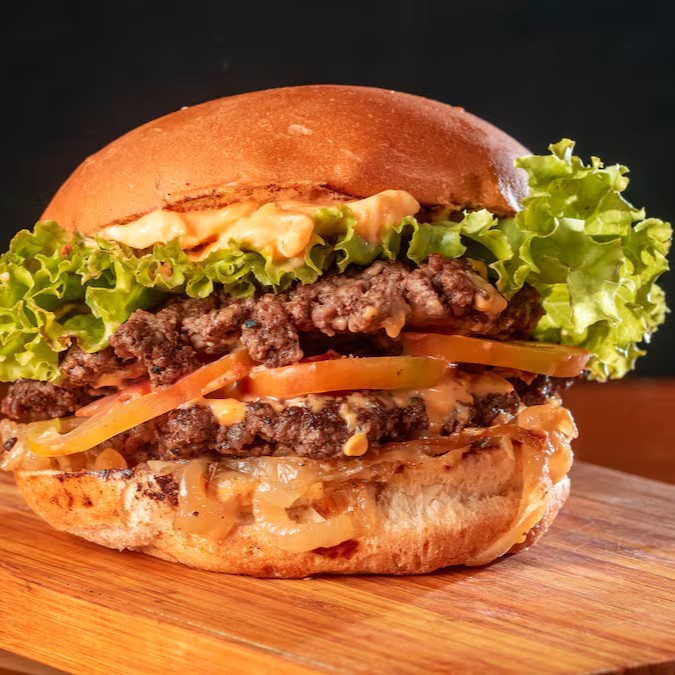 Duas carnes de alta qualidade, pesando 60 gramas cada, cuidadosamente selecionadas e tostadas à perfeição na chapa. Acompanhado de generosas camadas do nosso queijo americano secreto, cujo sabor único derrete na boca. Finalizado com cebolas delicadamente refogadas na chapa, tomates frescos e alface americana, proporcionando uma explosão de sabores.