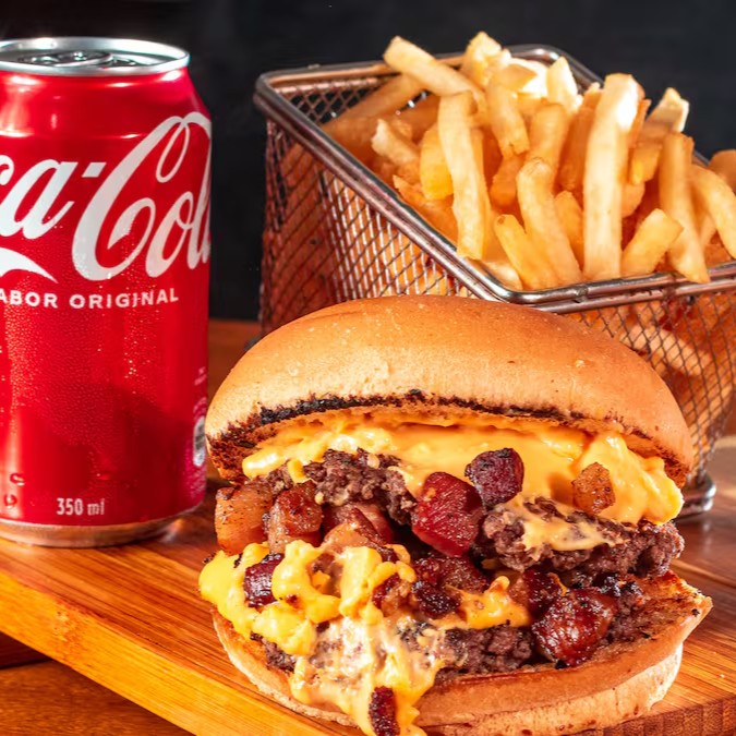 Duas porções de 80 gramas de carne nobre grelhadas na chapa até atingirem o ponto perfeito. O bacon ultra crocante gera um sabor incomparável. O toque final fica por conta do nosso queijo americano artesanal, que garante um sabor autêntico e distinto. O combo ainda inclui batatas fritas de corte 10 mm, de textura crocante e sabor marcante, e uma Coca Cola super gelada por nossa conta.