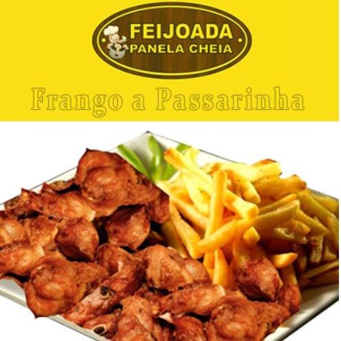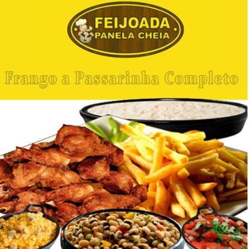 Embalagem de 1.100 com frango a passarinha + 2 embalagens de 750ml de feijão preto ou macassar + 2 embalagens de 750ml com arroz + embalagem de 750ml de batata frita +refrigerante de 1,5 litros + farofa + Vinagrete.