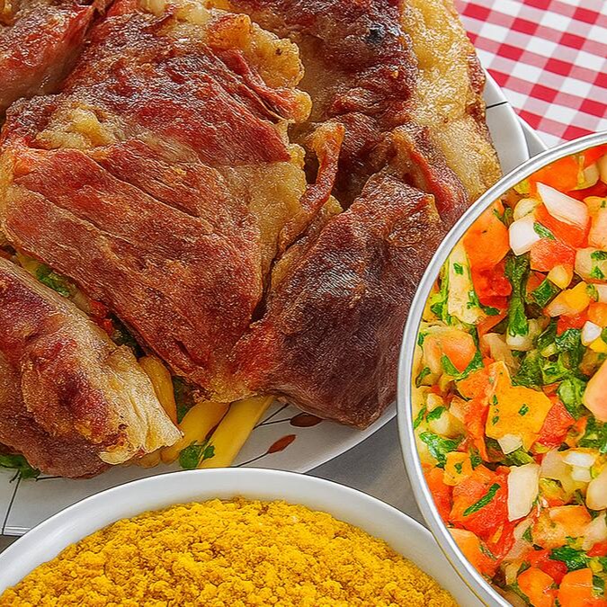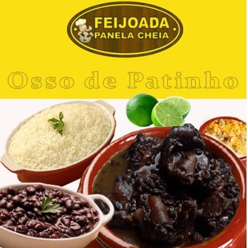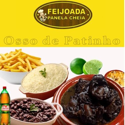3 ossos de Patinho inteiros com charque + embalagem de 750ml com arroz + embalagem de 750ml com feijão preto + embalagem de 750ml com batata frita + limão + farofa + vinagrete + refrigerante 1,5 litros.