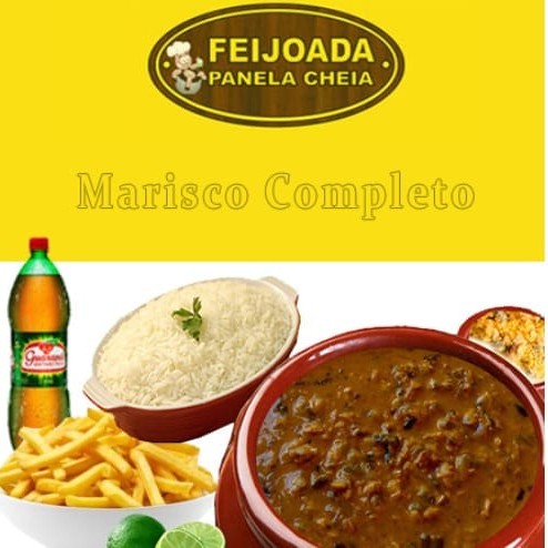 Embalagem de 1.100ml com mocofava + embalagem de 1.100ml com arroz + embalagem de 750ml de batata frita + refrigerante de 1,5 litros + farofa + vinagrete + limão.