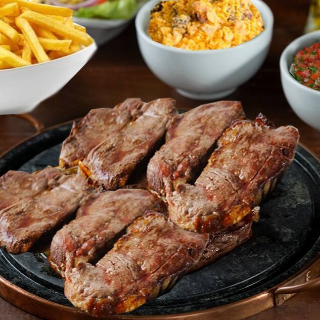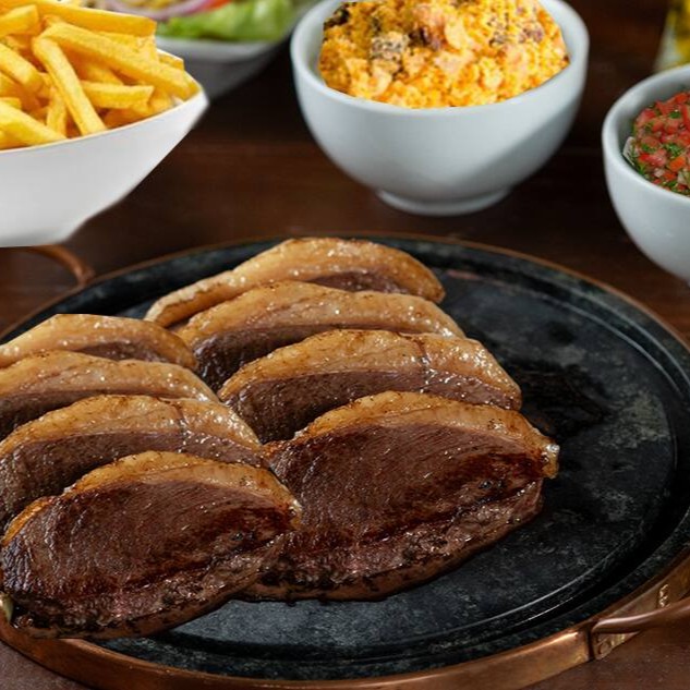400gr de Picanha na brasa acompanhada de batata frita, farofa e vinagrete.