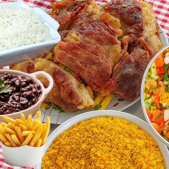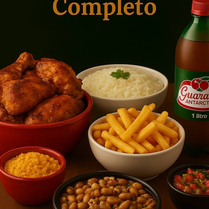 Embalagem de 750ml com frango a passarinha + embalagem de 1.100ml de feijão preto ou macassar + embalagem de 1.100ml com arroz + embalagem de 750ml de batata frita + refrigerante de 1,5 litros + farofa + vinagrete.