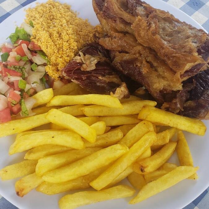300 gramas de charque + farofa + vinagrete + batata frita.