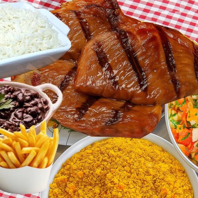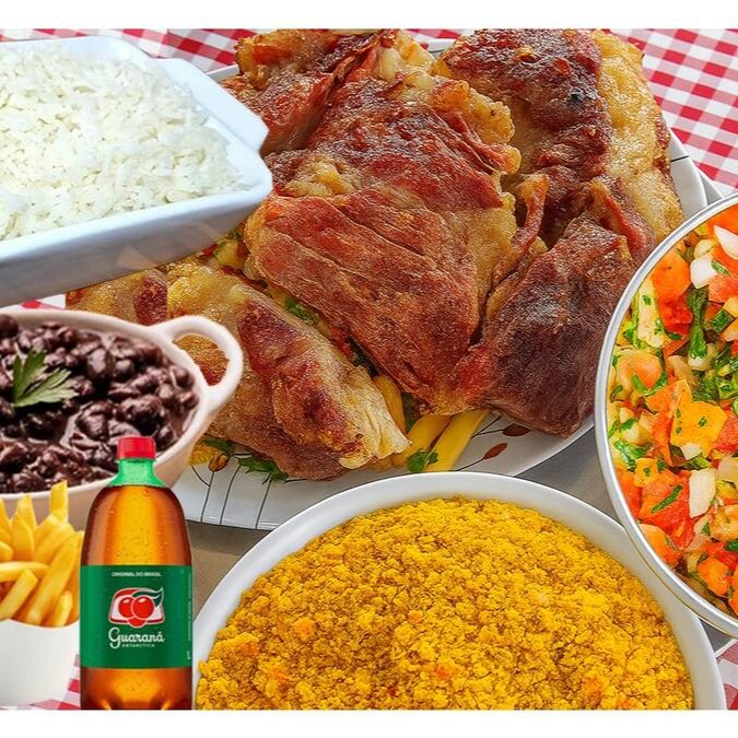 800 gramas de picanha na brasa + 2 embalagens de 750ml com arroz + 2 embalagens de 750ml de feijão preto ou macassar + vinagrete + farofa + embalagem de 750ml com batata frita + refrigerante de 1,5 litros.