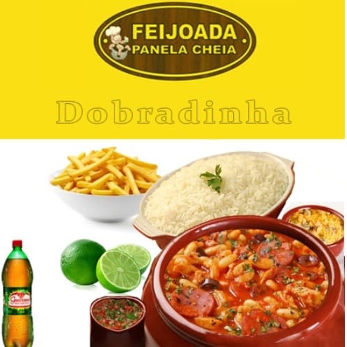 2 embalagens de 750ml com feijoada + 2 embalagens de 750ml com arroz + embalagem de 750ml com batata frita + refrigerante de 1,5 litros + farofa + vinagrete + limão.
