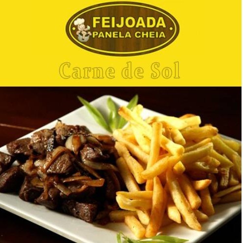 Embalagem de 1100ml de carne de sol picadinha com feijão macassar e Farofa + embalagem de 1100ml com arroz + vinagrete + embalagem de 750ml de batata frita + refrigerante de 1,5 litros.