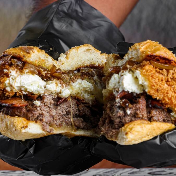 Pão de bacon, blend artesanal 150g, bacon, creme cheese empanado, barbecue.