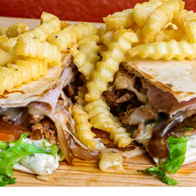 Pão sírio, frango 200g, queijo mussarela, presunto, fritas 150g, salada.