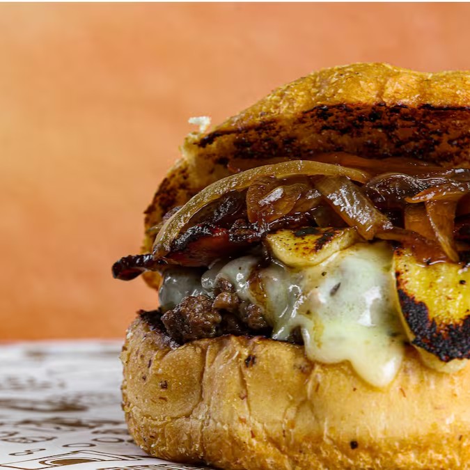 Pão de bacon, blend artesanal 150g, queijo coalho, bacon, banana caramelizada, cebola caramelizada, molho da casa.