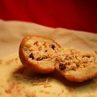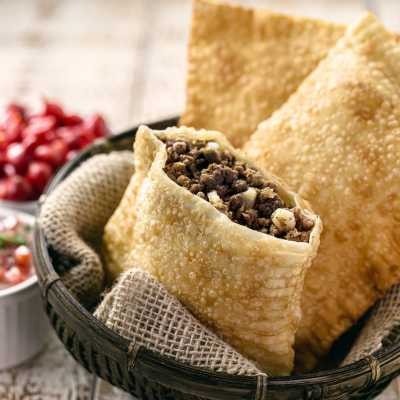 Massa recheada com frango, uva passa e pimenta, misturada ao açúcar e canela depois de frito. Uma combinação exótica e saborosa que surpreende o paladar.
