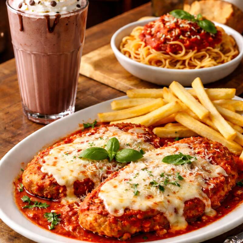 Parmegiana De Frango Para 2 Pessoas Com Milkisheike 400 Ml De Chocolate