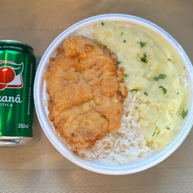 Marmita com delicioso filé de frango empanado na massa crocante acompanhado de arroz branco, feijão e purê de batatas inglesas. Acompanha refrigerante lata Guaraná Antárctica lata 350ml bem gelada. Marmita indicada para 01 pessoa.