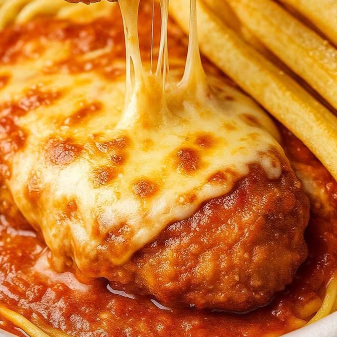 Parmegiana de frango,macarrão,molho de tomate,quejos e fritas
