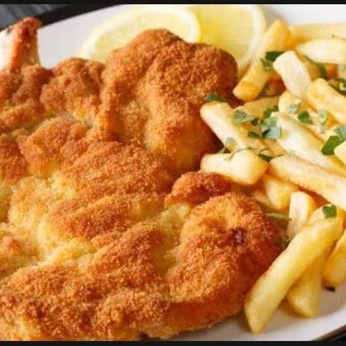 Filé de frango empanado,queijo mussarela,arroz refogado,molho de tomate,parmesão ralado,purê de batata.