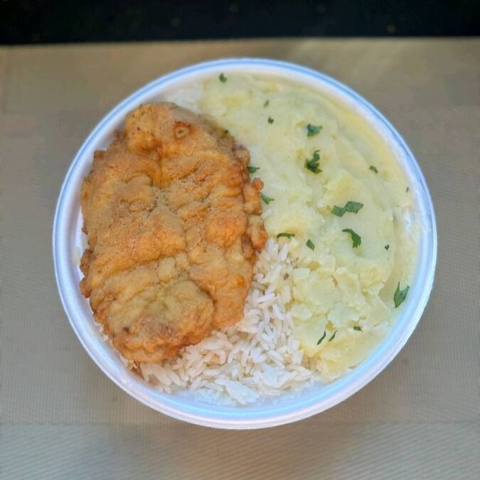 Filé de frango empanado, arroz refogado, purê de batata.