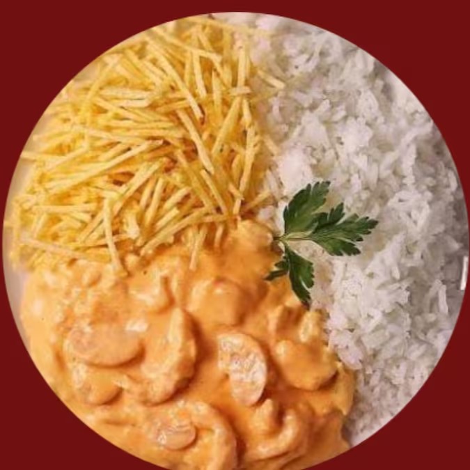 Marmita com delicioso filé de frango ao molho estrogonofe acompanhado de arroz branco e batatas fritas.. Acompanha refrigerante Coca Cola lata Zero sem açúcar 350ml bem gelada. Marmita indicada para 01 pessoa.