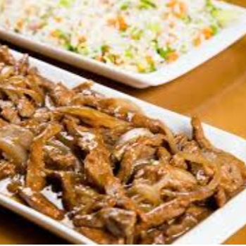 - carne fatiada, cebola, molho shoyu, acompanhamento arroz chop suey.