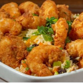 - camarão com casca, sem cabeça fritos ao alho e óleo levemente empanado.