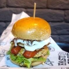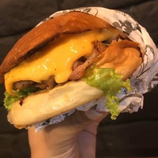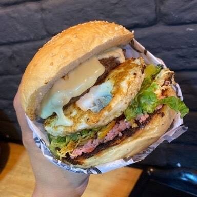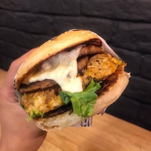Delicioso búrguer com pão, duas carnes artesanais, mussarela, presunto, ovo, bacon, calabresa, cebola caramelizada, milho e ervilha.