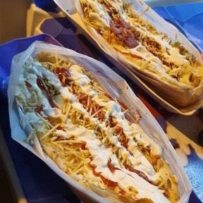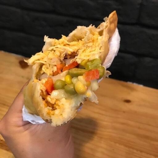 Pão, salcisinha, charque desfiada, tomate, cebola, milho e ervilha, batata palha e queijo ralado