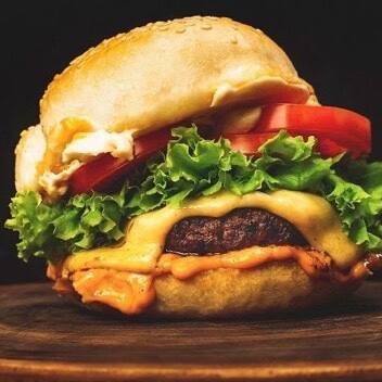 Maravilhoso búrguer com pão, carne artesanal, mussarela, ovo, alface, tomate, cebola caramelizada, milho e ervilha.